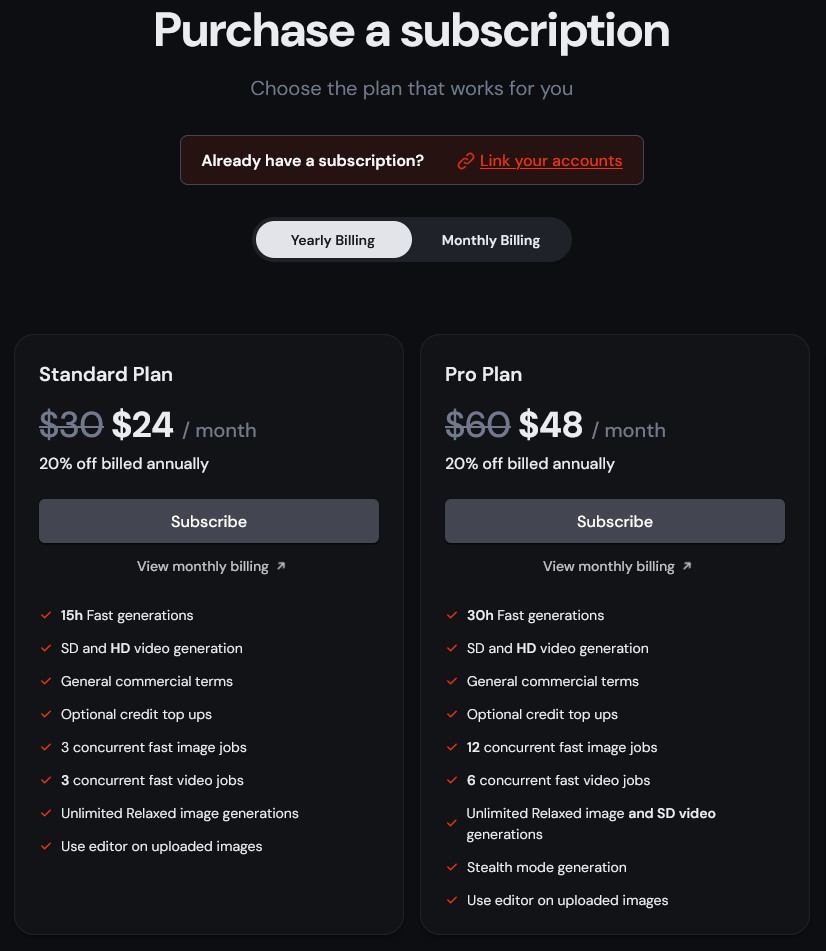 ÜCRETLİ: Temel, Standart ve Pro gibi aylık abonelik planları mevcuttur. Bu planlar, aylık "GPU dakikası" sınırı, hızlı moda erişim, özel görsel üretme ve ticari kullanım hakları gibi özellikler sunar. Ücretsiz tier sürekli olarak sunulmamaktadır.